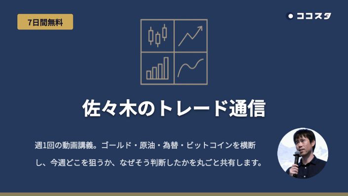 ゴールド、原油、為替、ビットコイン。毎週の動画で、佐々木が実際に狙うポイントと、その判断に至った思考プロセスを隠さず見せます。同じ画面を見ながら「なぜそう考えたか」を追体験できる。答えではなく、考え方が手に入る週刊講義です。